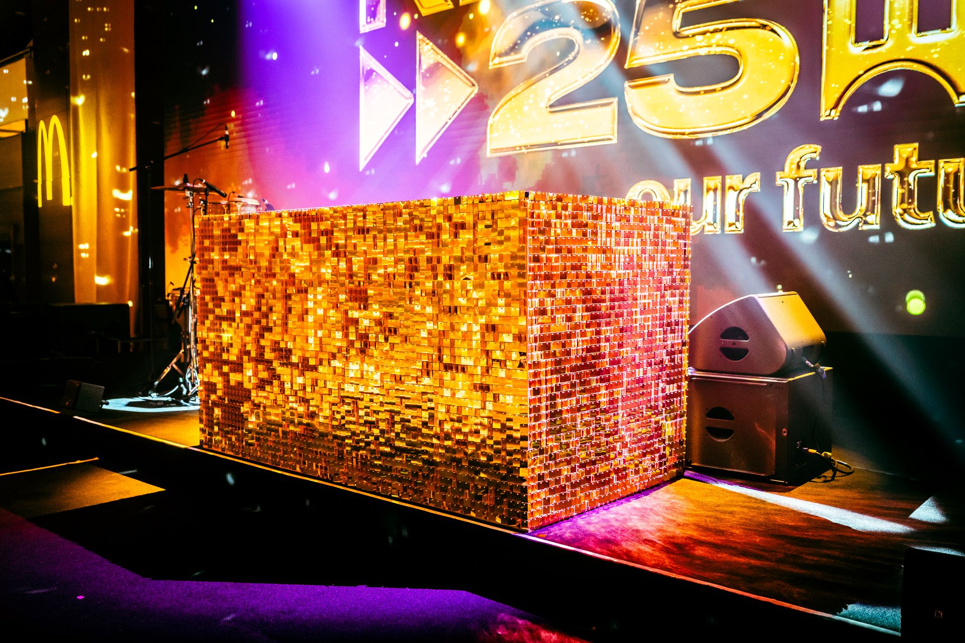 Pro zahraničního klienta jsme realizovali tematicky večer, kde se celý prostor proměnil v zářící Golden Party. Elegantní dekorace, světelné efekty a jedinečný vizuální styl podtrhly slavnostní charakter celé akce.