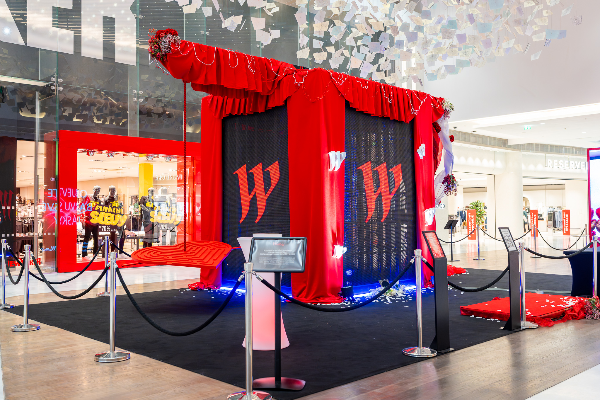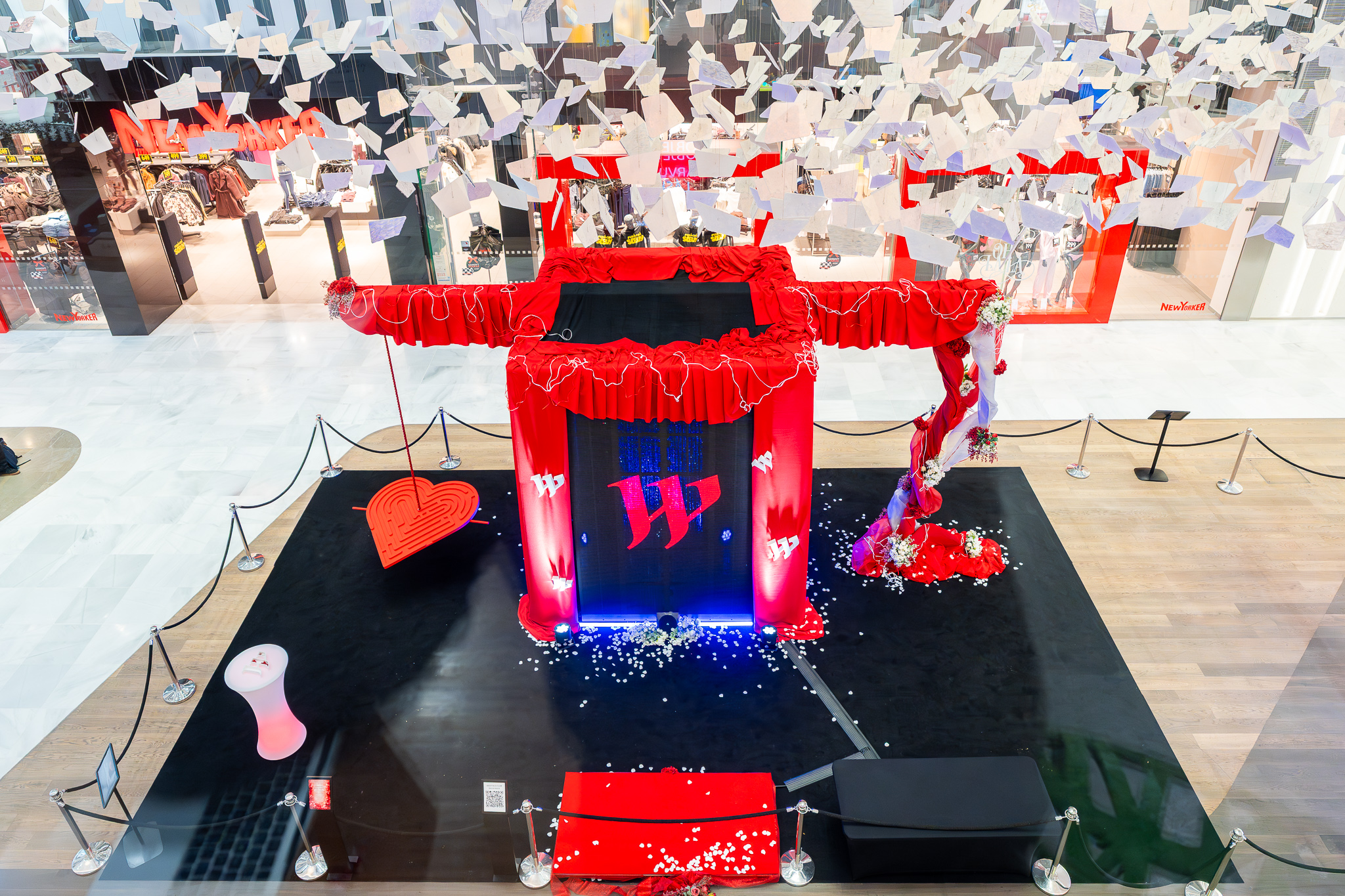 Ve Westfield Černý Most jsme realizovali valentýnkou aktivaci, jejíž scénografie kombinovala transparentní LED obrazovku, volumetrickou LED instalaci a látkové dekorace, které společně vytvořily výrazný valentýnský prvek v prostoru centra.
