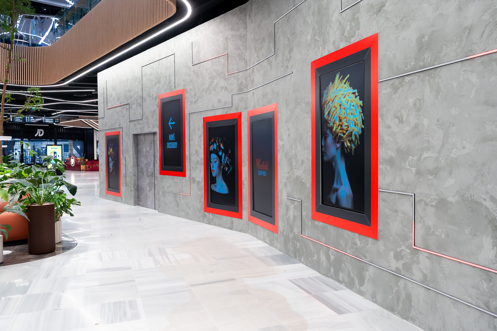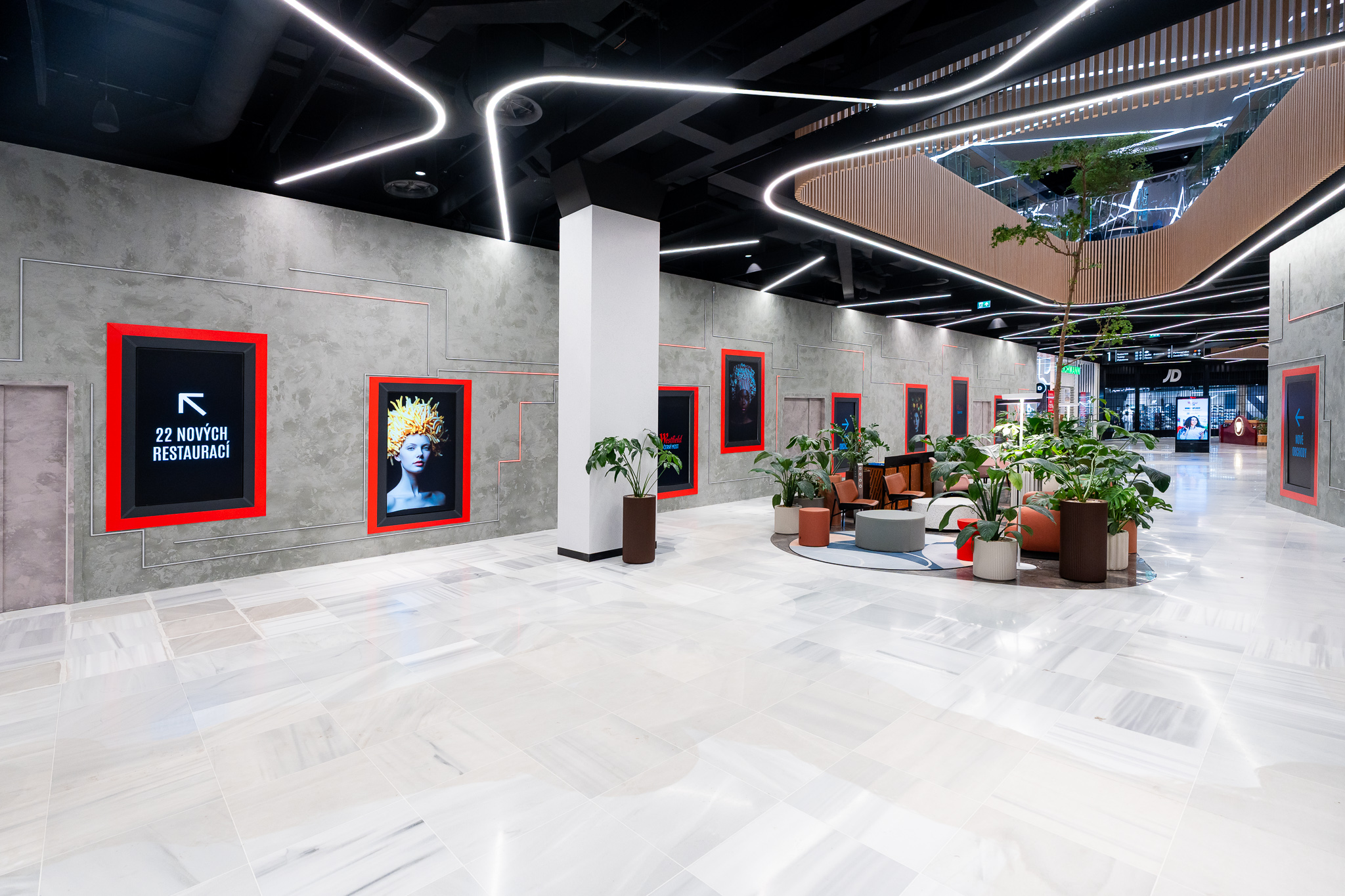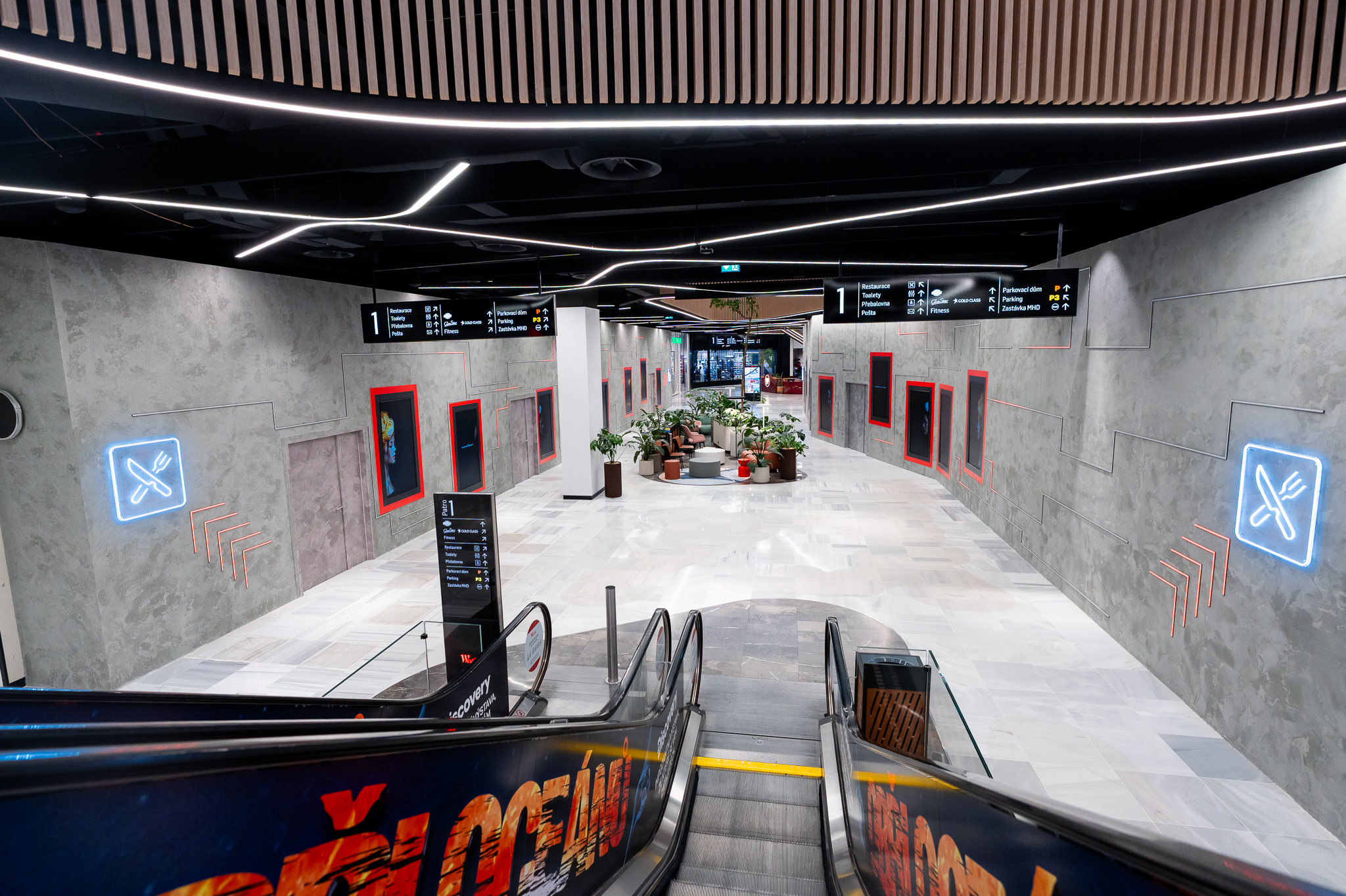 Ve stejném centru jsme zároveň instalovali dočasný betonový tunel s digitálními a světelnými prvky, který proměnil běžný průchod v moderní vizuální instalaci.